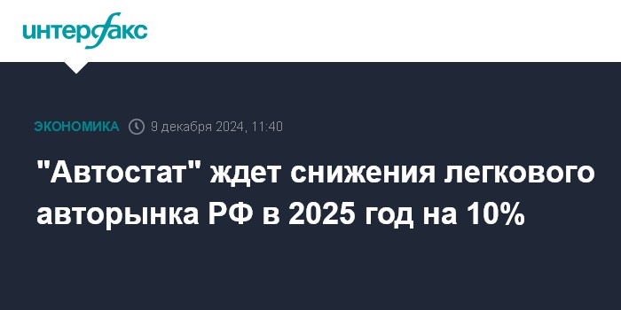 Москва. 9 декабря. INTERFAX.RU - Продажи новых легковых автомобилей в РФ в 2025 году могут снизиться в базовом сценарии на 10%, до 1,43 млн единиц, прогнозируют эксперты аналитического агентства "Автостат".