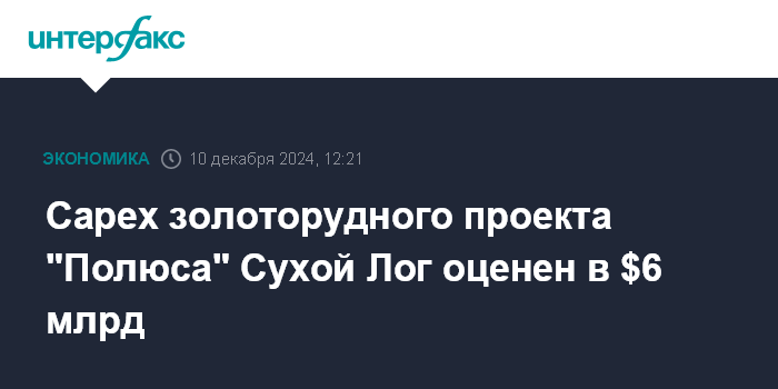 Москва. 10 декабря. INTERFAX.RU - Capex проекта Сухой Лог в Иркутской области - крупнейшего проекта развития "Полюса", оценен в $6 млрд, говорится в презентации компании.