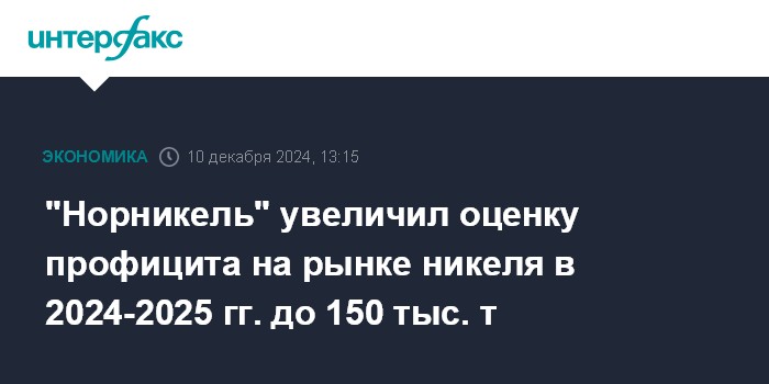 Москва. 10 декабря. INTERFAX.RU - "Норильский никель" ожидает профицита на рынке никеля в 2024-2025 гг. на уровне 150 тыс. тонн, говорится в опубликованном компанией во вторник обзоре рынка металлов.