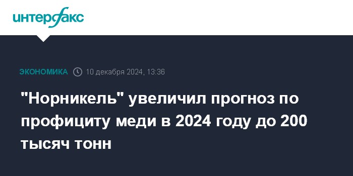 Москва. 10 декабря. INTERFAX.RU - "Норникель" увеличил прогноз по избытку меди на мировом рынке в 2024 году до 200 тысяч тонн на фоне снижения опасений дефицита предложения и уязвимости спроса, говорится обзоре рынка металлов.