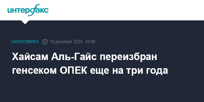 Москва. 10 декабря. INTERFAX.RU - Хайсам Аль-Гайс переизбран генеральным секретарем ОПЕК еще на три года, начиная с августа 2025 года, сообщил секретариат организации.