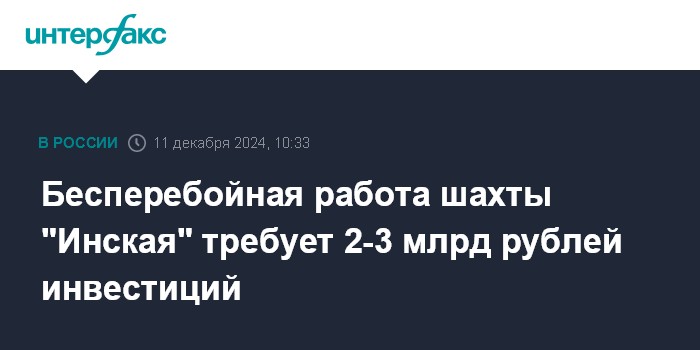 Бесперебойная работа шахты "Инская" требует 2-3 млрд рублей инвестиций