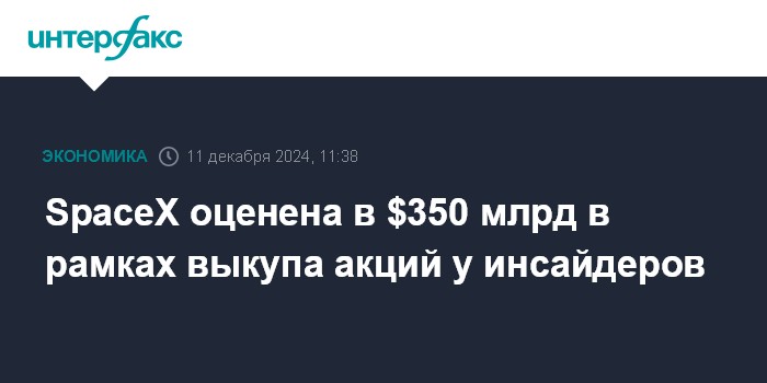Москва. 11 декабря. INTERFAX.RU - Американская аэрокосмическая компания Илона Маска SpaceX заключила сделку о выкупе акций у инсайдеров исходя из оценки стоимости всей компании в $350 млрд, сообщает Financial Times со ссылкой на четырех источников, знакомых с ходом сделки.