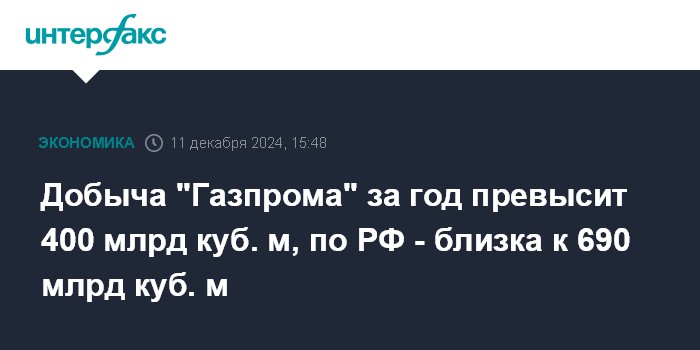 Добыча "Газпрома" за год превысит 400 млрд куб. м, по РФ - близка к 690 млрд куб. м