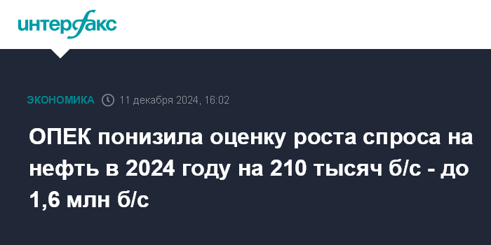 Москва. 11 декабря. INTERFAX.RU - ОПЕК четвертый раз подряд понизила оценку роста спроса на нефть в 2024 году - теперь сразу на 210 тысяч баррелей в сутки - до 1,61 млн б/с, оценка роста на 2025г снизилась лишь на 90 тысяч б/с и составляет 1,45 млн б/с.