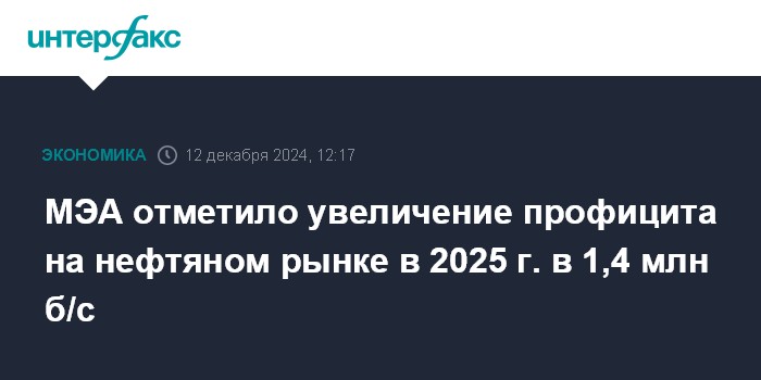 Москва. 12 декабря. INTERFAX.RU - Решение ОПЕК+ отложить постепенное наращивание добычи нефти на апрель 2025 года добавит на нефтяной рынок 460 тыс. б/с, это увеличит профицит на нефтяном рынке до 1,4 млн б/с, пишет Международное энергетическое агентство (МЭА) в ежемесячном отчете.
