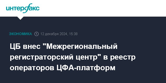 Москва. 12 декабря. INTERFAX.RU - Банк России принял решение о включении АО "Межрегиональный регистраторский центр" в реестр операторов информационных систем (ОИС), в которых осуществляется выпуск цифровых финансовых активов (ЦФА), говорится на сайте регулятора.