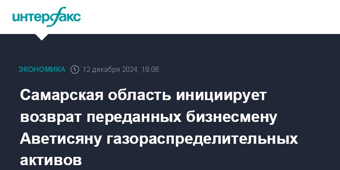 Москва. 12 декабря. INTERFAX.RU - Самарская область инициирует возврат газораспределительных активов, ранее переданных предпринимателю Владимиру Аветисяну и его сыну Ивану, сказал губернатор Вячеслав Федорищев в четверг в ходе заседания регионального штаба по догазификации региона.
