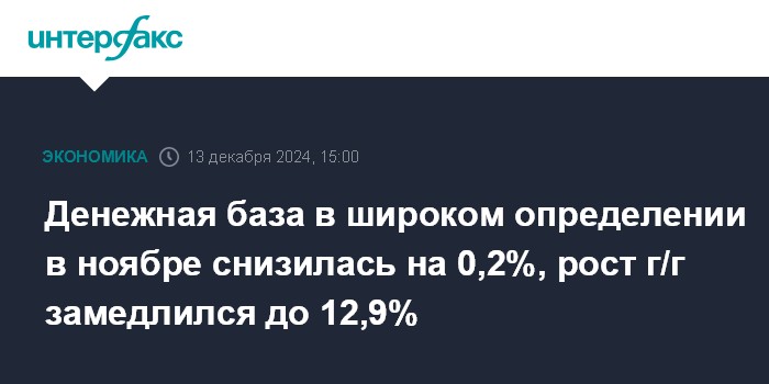 Денежная база в широком определении в ноябре снизилась на 0,2%, рост г/г замедлился до 12,9%