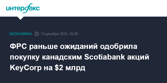 ФРС раньше ожиданий одобрила покупку канадским Scotiabank акций KeyCorp на $2 млрд