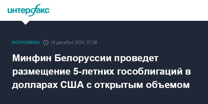 Москва. 16 декабря. INTERFAX.RU - Министерство финансов Белоруссии объявило о размещении 18 декабря на Белорусской валютно-фондовой бирже государственных облигаций (выпуск №329), номинированных в долларах США.
