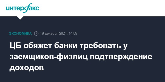 Москва. 16 декабря. INTERFAX.RU - Банк России с 1 октября 2025 года обяжет банки требовать у физлиц официальные документы о доходах при выдаче кредитов на сумму свыше 1 млн рублей для минимизации резервов.