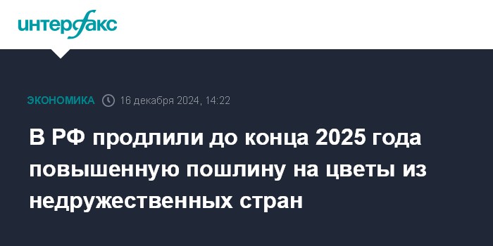 Москва. 16 декабря. INTERFAX.RU - Правительство РФ продлило до конца 2025 года повышенную пошлину на поставки цветов из недружественных стран.