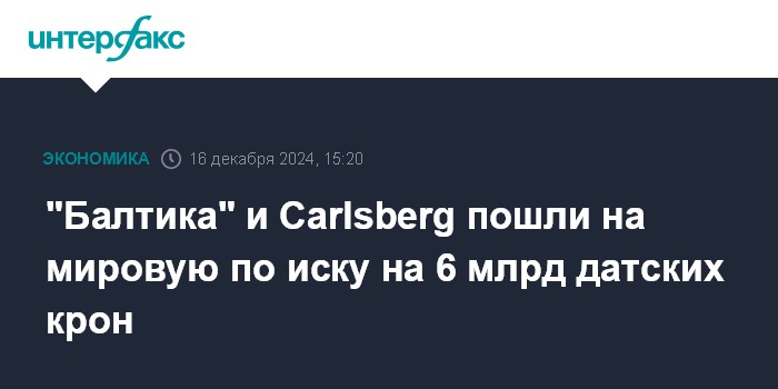 Москва. 16 декабря. INTERFAX.RU - Арбитражный суд Санкт-Петербурга и Ленинградской области в понедельник утвердил мировое соглашение по иску ООО "Пивоваренная компания "Балтика" к датской Carlsberg Group – Carlsberg Breweries A/S, Carlsberg Sverige Aktiebolag, Carlsberg Deutschland GmbH и ООО "Хоппи Юнион" – о взыскании убытков в размере 6,246 млрд датских крон, сообщается в картотеке арбитражных дел.