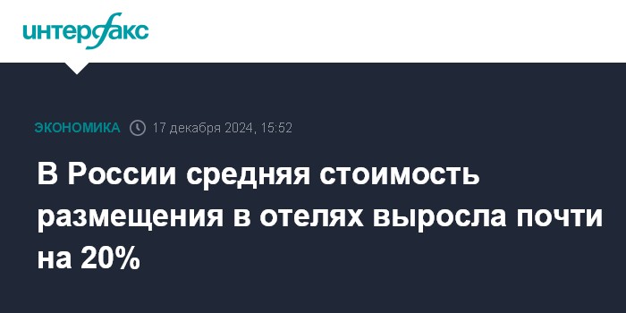 Москва. 17 декабря. INTERFAX.RU - В России в 2024 году средняя стоимость ночи в гостинице выросла на 19,8% по сравнению с 2023 годом, больше всего подорожали отели категорий 4-5*, сообщил на пресс-конференции президент Российского союза туриндустрии Илья Уманский.