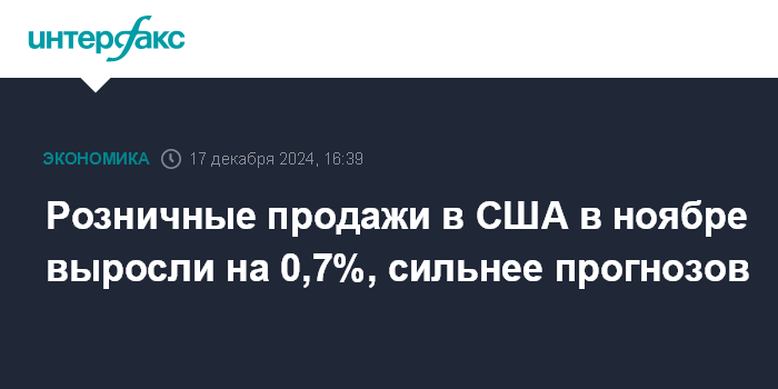 Москва. 17 декабря. INTERFAX.RU - Розничные продажи в США в ноябре увеличились на 0,7% относительно предыдущего месяца, сообщило министерство торговли страны.