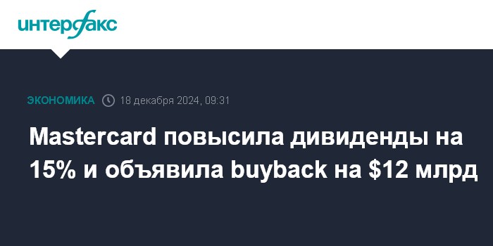 Mastercard повысила дивиденды на 15% и объявила buyback на $12 млрд