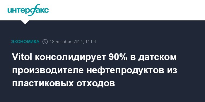 Москва. 18 декабря. INTERFAX.RU - Международный энерготрейдер Vitol приобретает контрольный пакет акций (66,84%) датской Waste Plastic Upcycling (WPU), которая перерабатывает пластиковые отходы в нефть для дальнейшего производства нафты или керосина и авиационного топлива.