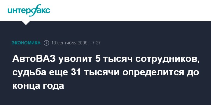 Москва. 10 сентября. INTERFAX.RU - ОАО "АвтоВАЗ" объявит в понедельник об увольнении 5 тыс. сотрудников, судьба еще 31 тыс. определится до конца года, сообщили "Интерфаксу" несколько источников, близких к компании и правительству Самарской области.