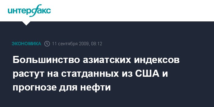 Москва. 11 сентября. INTERFAX.RU - Большинство азиатских индексов повышаются в пятницу после того, как число заявок на пособие по безработице в США снизилось и Международное энергетическое агентство (МЭА) улучшило прогноз спроса на нефть, сообщает агентство Bloomberg. Оптимизм инвесторов несколько сдерживает более медленный рост ВВП в Японии, чем ожидалось в соответствии с предварительными данными. Японский ВВП увеличился на 2,3% во втором квартале, а не на 3,7%, как объявлялось ранее.