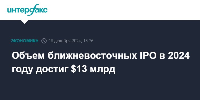 Москва. 18 декабря. INTERFAX.RU - Совокупный объем ближневосточных IPO в 2024 году достиг $13 млрд, и эксперты ожидают сохранения высокой активности в этом секторе в предстоящем году.