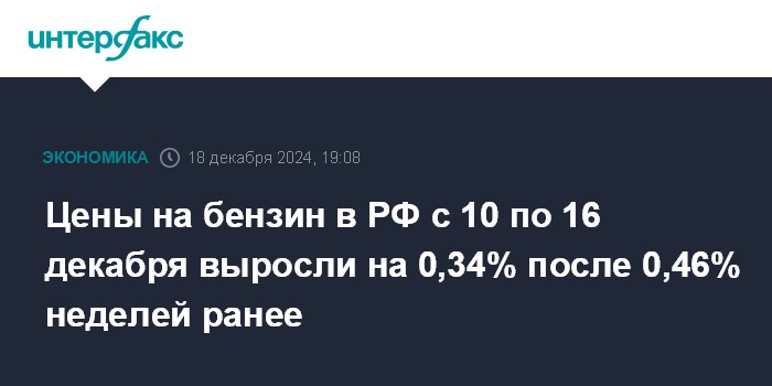 Цены на бензин в РФ с 10 по 16 декабря выросли на 0,34% после 0,46% неделей ранее