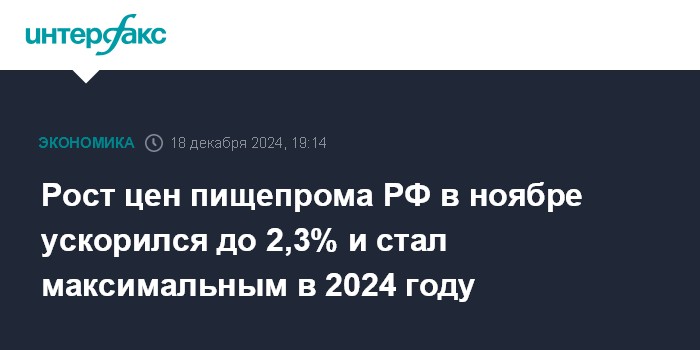 Рост цен пищепрома РФ в ноябре ускорился до 2,3% и стал максимальным в 2024 году