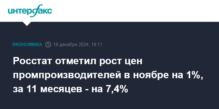 За январь-ноябрь 2024 года цены производителей выросли на 7,4%.
