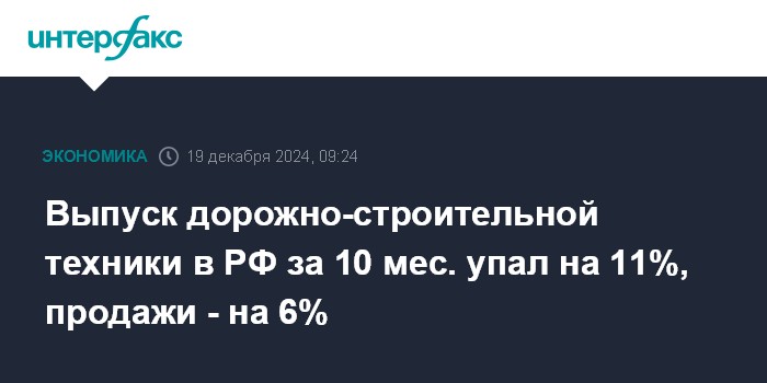 Москва. 19 декабря. INTERFAX.RU - Производство российской дорожно-строительной техники в январе-октябре 2024 года снизилось в денежном выражении на 10,9% (до 63,8 млрд руб.), отгрузки на внутренний рынок - на 5,6% (до 61,1%), сообщили "Интерфаксу" в Российской ассоциации производителей специализированной техники и оборудования (Росспецмаш).