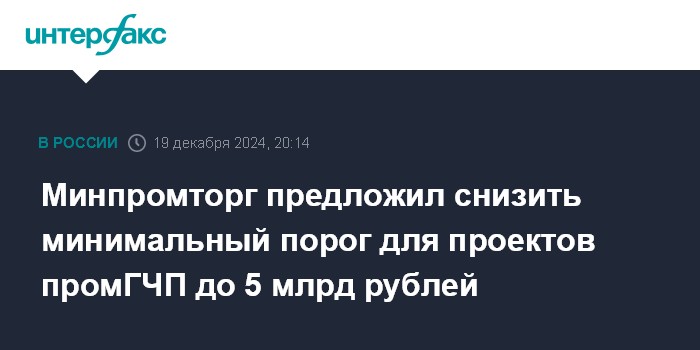 Москва. 19 декабря. INTERFAX.RU - Минпромторг предлагает снизить минимальный порог стоимости проектов в сфере промышленности, реализуемых с использованием механизма государственно-частного партнерства (ГЧП), до 5 млрд рублей.