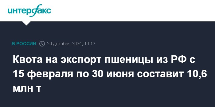 Москва. 20 декабря. INTERFAX.RU - Тарифная квота на экспорт пшеницы из РФ, которая будет действовать с 15 февраля по 30 июня 2025 года, составит 10,6 млн тонн, сообщает пресс-служба правительства.
