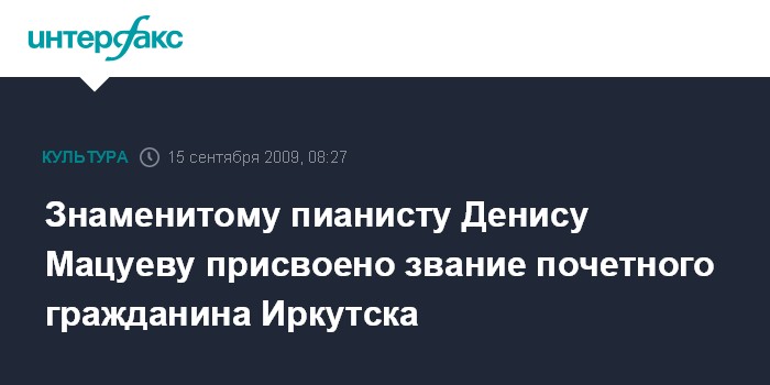 Москва. 15 сентября. INTERFAX.RU - Мэр Иркутска Владимир Якубовский вручил регалии Почетного гражданина города Иркутска знаменитому пианисту Денису Мацуеву. Церемония присвоения звания состоялась в Музыкальном театре им. Н.М.Загурского на творческой встрече Д. Мацуева с иркутской публикой, сообщает пресс-служба администрации Иркутска.