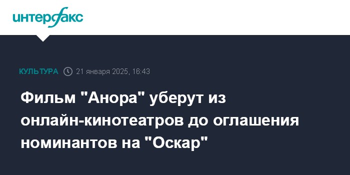 "С сегодняшнего дня, 21 января 2025 года, на время анонсирования номинаций и подготовки к церемонии "Оскар" фильм Шона Бейкера "Анора" временно уйдет из онлайн кинотеатров в России", - сообщили представители компании Arna Media, которая является правообладателем "Аноры" на территории РФ.