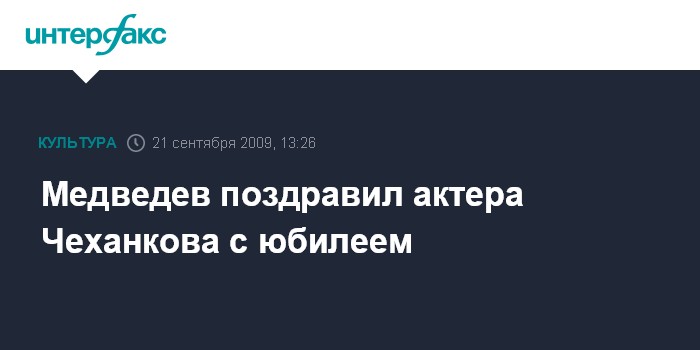Москва. 21 сентября. INTERFAX.RU - Президент России Дмитрий Медведев поздравил актера Центрального академического театра Российской Армии, народного артиста РСФСР Федора Чеханкова с 75-летием, сообщает в понедельник пресс-служба главы государства. "Замечательный драматический актер, на сцене и в кино Вы создали целую галерею запоминающихся образов. За каждым из них - огромная внутренняя работа, знание человеческой психологии и высокий профессионализм. Безупречное чувство стиля, неповторимая индивидуальность и умение импровизировать всегда отличали Ваше творчество", - говорится в поздравлении Медведева.