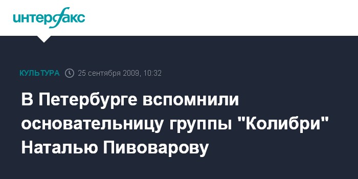 Москва. 25 сентября. INTERFAX.RU - В Петербурге в четверг прошли памятные мероприятия, посвященные второй годовщине со дня смерти солистки группы "Колибри" Натальи Пивоваровой, сообщили "Интерфаксу" в группе. "Днем на Богословском кладбище, где похоронена Наташа, прошло богослужение", - рассказал собеседник. По его словам, вечером в новом клубе "Рок бар" прошел памятный концерт, в котором помимо группы "Колибри" приняли участие "Пепси", "Два самолета", "Мультфильмы" и другие популярные ансамбли. "Все они исполняли песни группы "Колибри", которые когда-то пела Наташа Пивоварова", - добавили в группе.