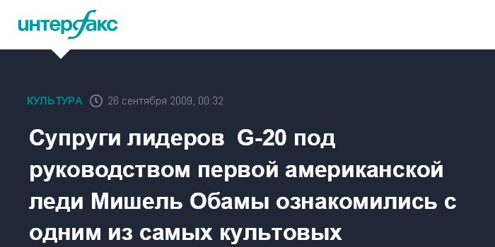 Питтсбург. 26 сентября. ИНТЕРФАКС - Пока лидеры "большой двадцатки" решали финансовые вопросы мирового значения, их супруги под руководством первой американской леди Мишель Обамы посвятили время культуре.