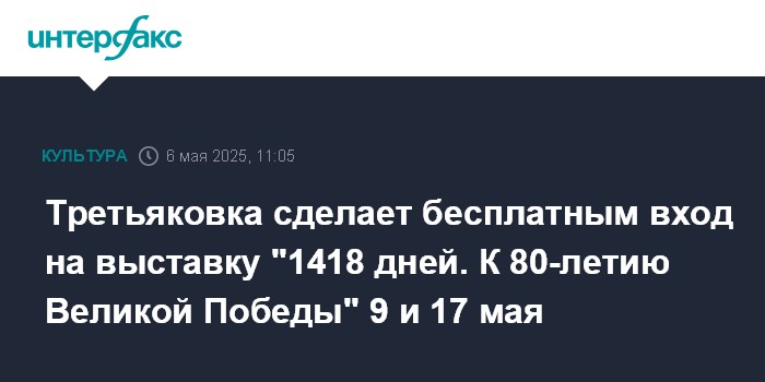 Москва. 6 мая. INTERFAX.RU - Вход на выставку "1418 дней. К 80-летию Великой Победы" Третьяковской галереи будет бесплатным 9 и 17 мая.