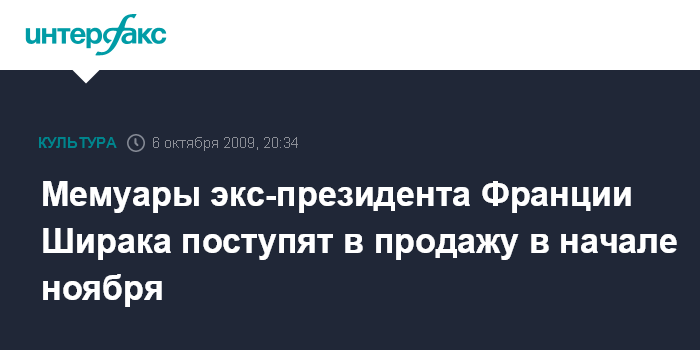 Париж. 6 октября. INTERFAX.RU - Книжные магазины Франции 5 ноября начнут продавать первый том мемуаров бывшего президента Франции Жака Ширака, сообщают во вторник парижские СМИ.