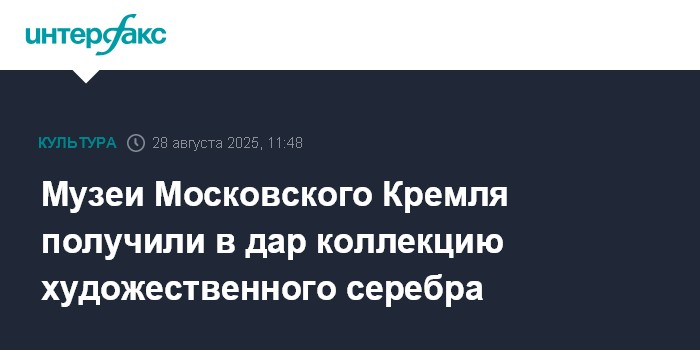 Москва. 28 августа. INTERFAX.RU - Коллекция художественного серебра первой XV - начала ХХ веков поступила в дар Музеев Московского Кремля (ММК), сообщила генеральный директор ММК Елена Гагарина.