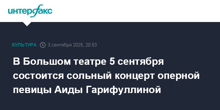 Москва. 3 сентября. INTERFAX.RU - На Исторической сцене Большого театра 5 сентября пройдет сольный концерт оперной певицы, заслуженной артистки России Аиды Гарифуллиной.