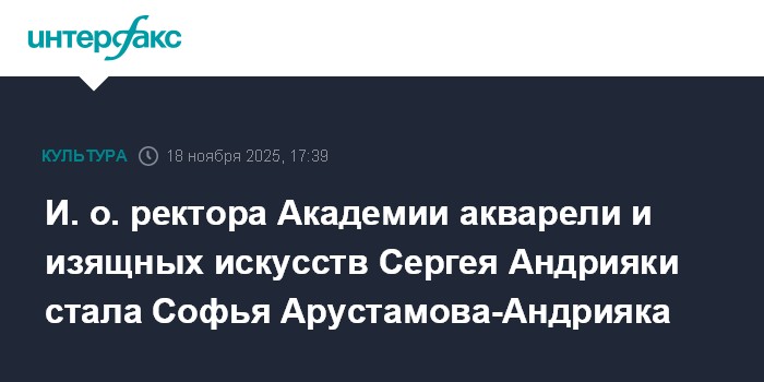 Москва. 18 ноября. INTERFAX.RU - Исполняющей обязанности ректора Академии акварели и изящных искусств Сергея Андрияки назначена Софья Арустамова-Андрияка, сообщила министр культуры РФ Ольга Любимова в своем канале в месседжере Max во вторник.