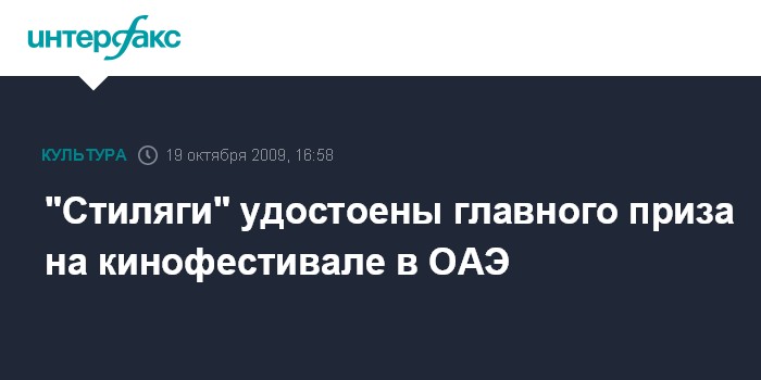 Москва. 19 октября. INTERFAX.RU - Фильм Валерия Тодоровского "Стиляги" завоевал Главный приз - "Черную жемчужину" средневосточного международного кинофестиваля в Абу-Даби.