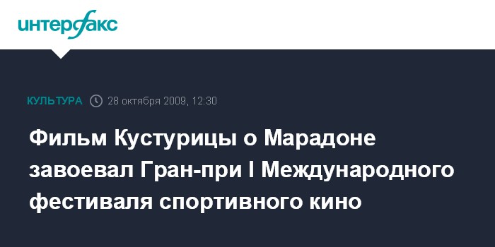 Москва. 28 октября. INTERFAX.RU – Победителем I Международного фестиваля спортивного кино, который прошел в Казани (Татарстан) 23-24 октября в рамах I Всероссийского спортивного форума "Россия - спортивная держава", стал документальный фильм Эмира Кустурицы "Марадона" (Франция-Испания, 2008).