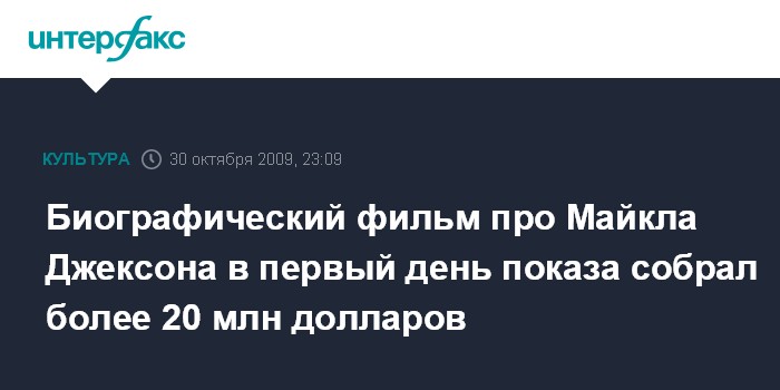 Лондон. 30 октября. INTERFAX.RU - Биографический фильм This is it, посвященный поп-идолу Майклу Джексону, за первый день показа собрал 20,1 млн долларов по всему миру, сообщает в пятницу британская редакция телеканала Эм-Ти-Ви.