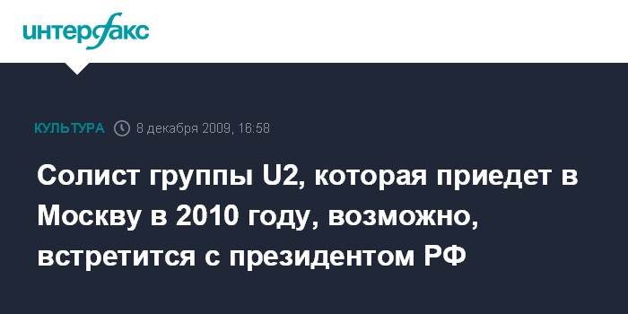 На вопрос журналистов, намерен ли солист U2 Боно встретиться с президентом РФ Дмитрием Медведевым во время визита в Москву, Надежда Соловьева ответила: "Наверняка захочет". "Думаю, что президент тоже захочет (встретиться с Боно – ИФ). Он же у нас рок-фэн", - добавил присутствовавший на пресс-конференции музыкальный критик Артемий Троицкий.
