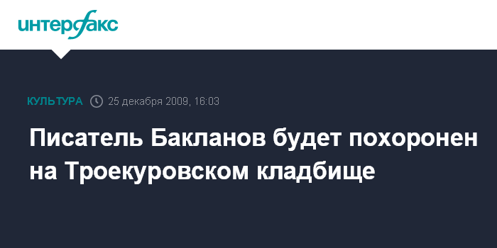 Ранее сообщалось, что гражданская панихида и прощание с Г.Баклановым состоятся в субботу в ритуальном зале Центральной клинической больницы по адресу: ул.Тимошенко, д.25. Церемония начнется в 11:30.