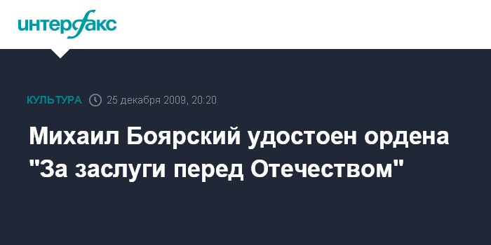 Москва. 25 декабря. INTERFAX.RU - Президент России Дмитрий Медведев своим Указом наградил Михаила Боярского орденом "За заслуги перед Отечеством" IV степени, сообщает в пятницу пресс-служба Кремля. Боярский награжден за большой вклад в развитие отечественного театрального и кинематографического искусства.