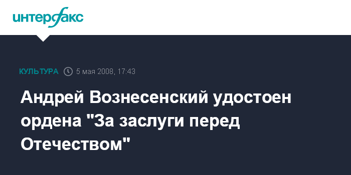 Москва. 5 мая. INTERFAX.RU - Президент России Владимир Путин своим указом наградил орденом "За заслуги перед Отечеством" II степени поэта Андрея Вознесенского. Как сообщает в понедельник пресс-служба Кремля, поэт награжден "за выдающиеся заслуги в развитии отечественной литературы и многолетнюю творческую деятельность".