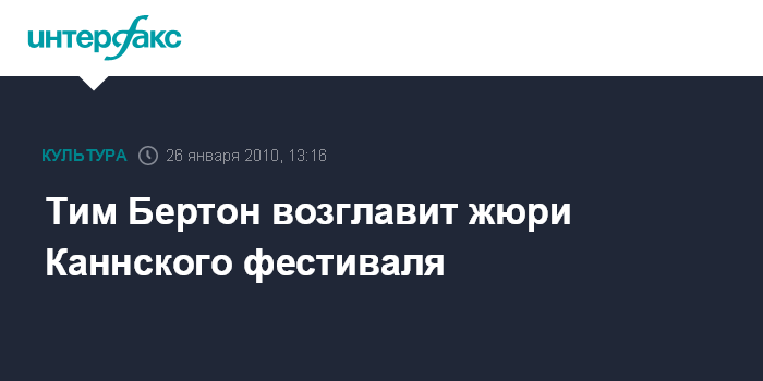 Москва. 26 января. INTERFAX.RU - Американский режиссер Тим Бертон станет председателем жюри Каннского кинофестиваля, который стартует 12 мая 2010 года. Как сообщает британская телерадиокорпорация BBC, Бертон заявил, что это для него "большая честь". "Это как сбывшаяся мечта", - заявил он.