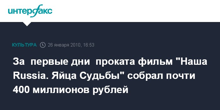 Москва. 26 января. INTERFAX.RU - Кассовые сборы фильма "Наша Russia. Яйца Судьбы", вышедшего на российские экраны 21 января, за первые четыре дня проката составили 375 000 000 рублей, сообщили "Интерфаксу" представители компании Comedy Club Production, участвовавшей в создании фильма.